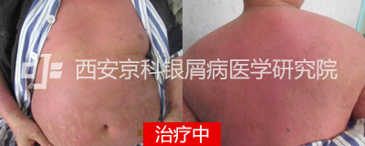 现病史:患者14年前因无明显诱因全身出现米粒大小红斑,瘙痒明显,曾在医院治疗,外用药:不详。口服药:不详,现病情加重今特来我院治疗。